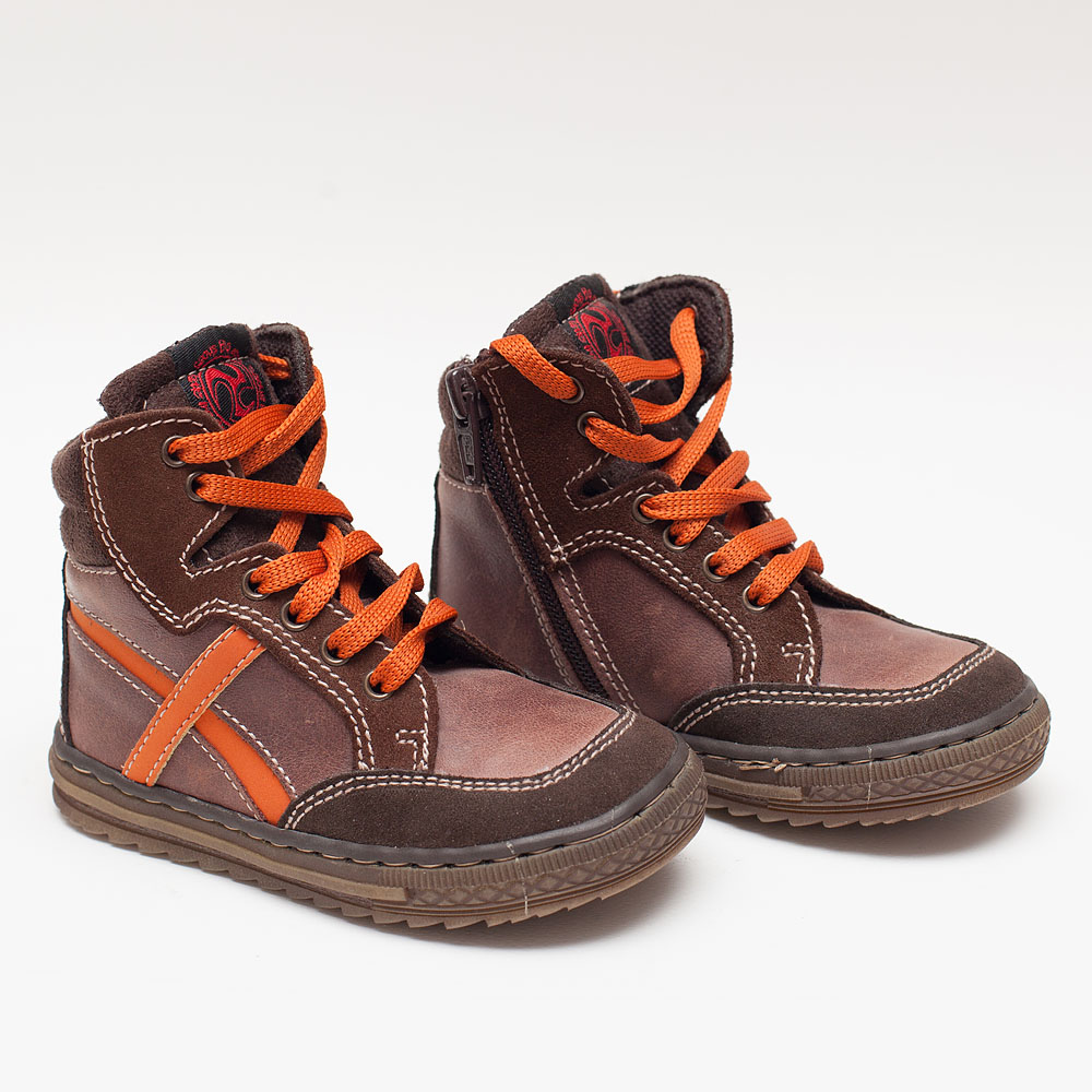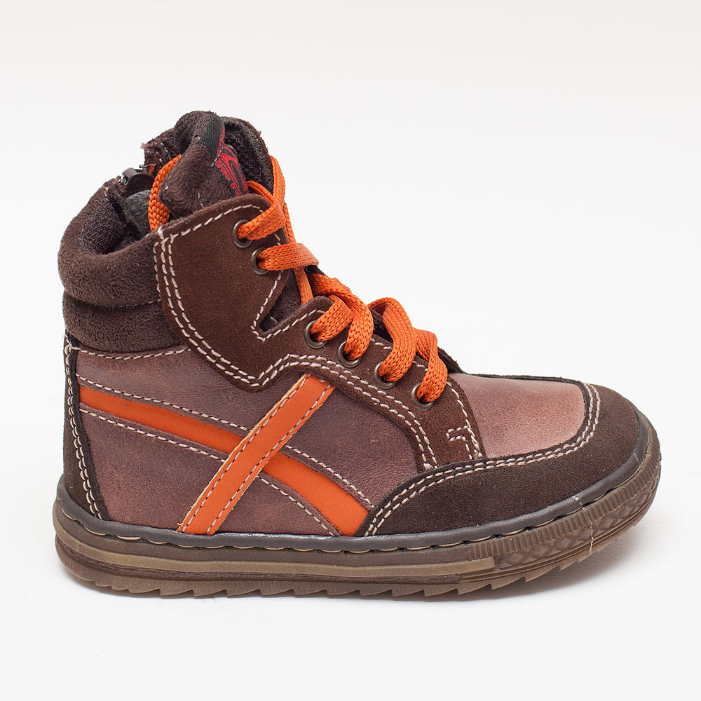 Αγορίστικα καφέ μποτάκια δερμάτινα με πορτοκαλί κορδόνια