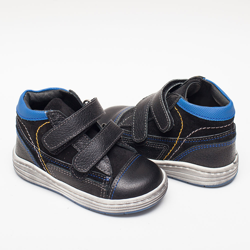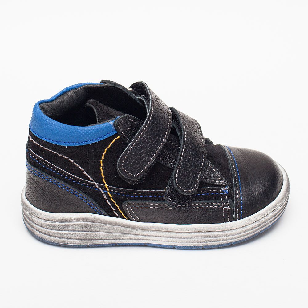 Μαύρο μποτάκι για αγόρια, δερμάτινο εξωτερικά και εσωτερικά, με δερμάτινο ανατομικό πατάκι και δυο αυτοκόλλητα για κούμπωμα.