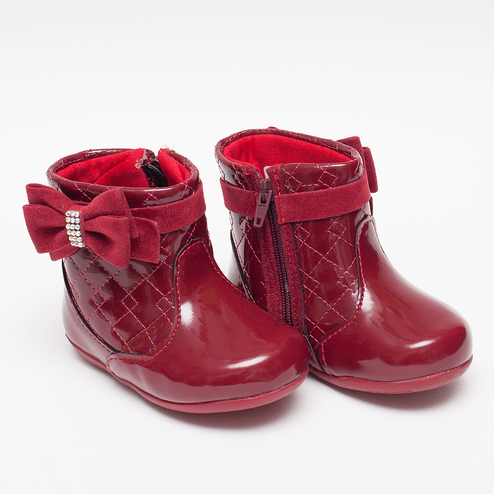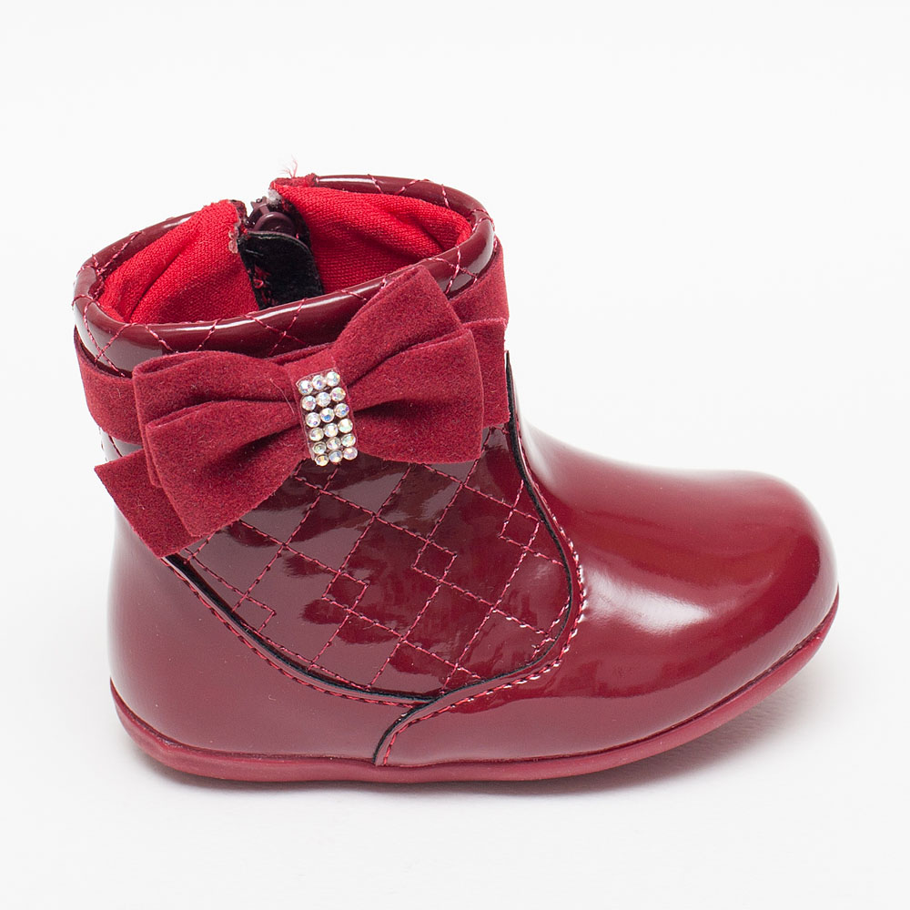 Μποτάκι για κορίτσια λουστρίν, σε δυο χρώματα,κόκκινο και μαύρο, με ειδικό ανατομικό πατάκι, ειδική σόλα που διευκολύνει τα πρώτα βήματα και στηρίζει το περπάτημα, βελούδινο φιόγκο με στολισμό και φερμουάρ για την εφαρμογή. Έχουν μικρή φόρμα. Αν είστε ανάμεσα σε δυο νούμερα προτιμήστε το μεγαλύτερο.