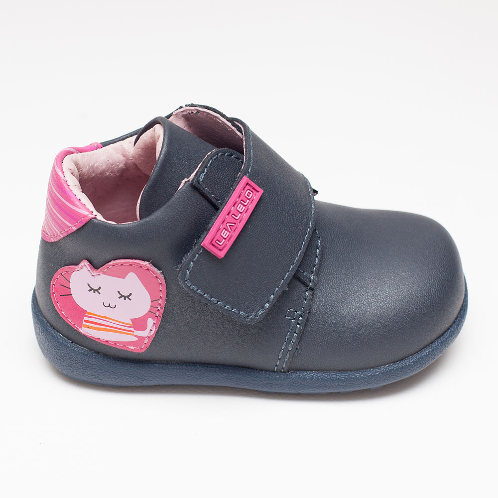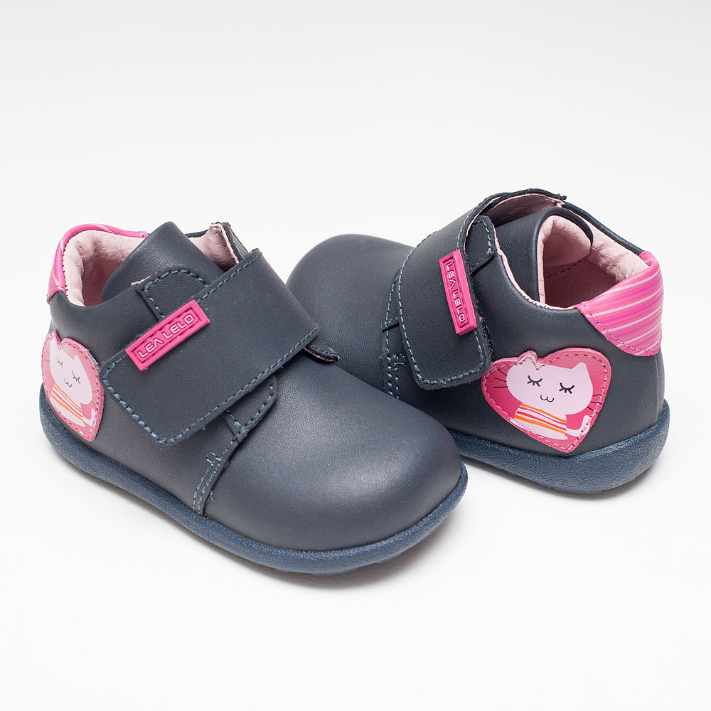 Μπλε δερμάτινο κοριτσίστικο μποτάκι με ένα αυτοκόλλητο για κούμπωμα, ροζ διακοσμητικό σχέδιο στο πλάι και ανατομικό δερμάτινο πατάκι.