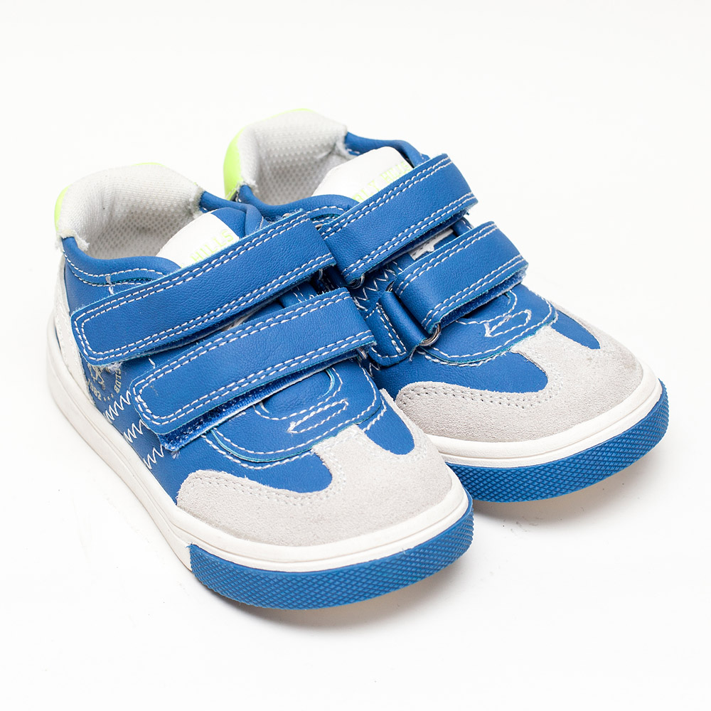 Μπλε αγορίστικο μποτάκι Δερμάτινο εξωτερικά και εσωτερικά Ανατομικό δερμάτινο πατάκι Μπλε δερμάτινο αγορίστικο μποτάκι με ένα αυτοκόλλητο για κούμπωμα, φερμουάρ και κορδόνια λάστιχο, διακοσμητικό στο πλάι και ανατομικό δερμάτινο πατάκι.